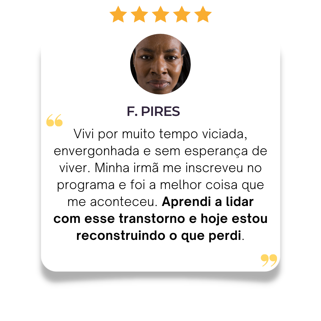 E no último módulo do programa, você vai saber o que fazer para lidar com o sentimento de culpa e vergonha. Você também vai aprender como recuperar relacionamentos importantes com familiares e amigos..
